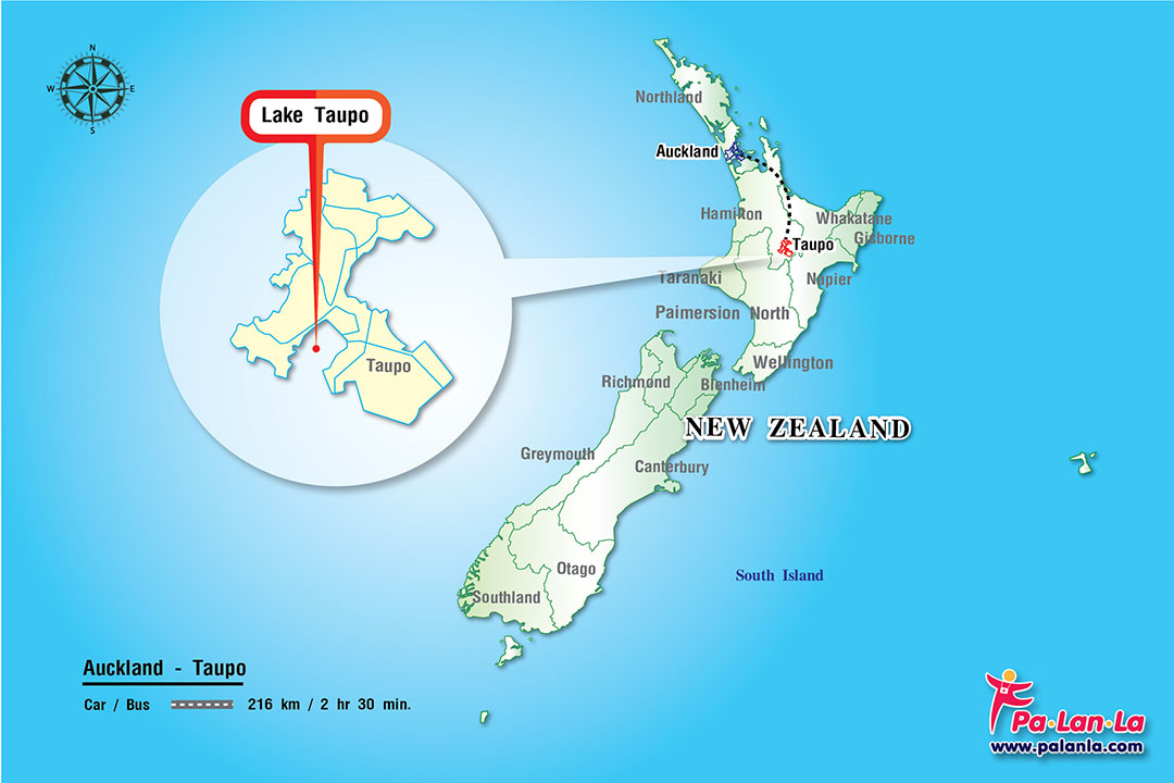 แผนที่ตั้ง ทะเลสาบเทาโป (Lake Taupo) เกาะเหนือ ประเทศนิวซีแลนด์