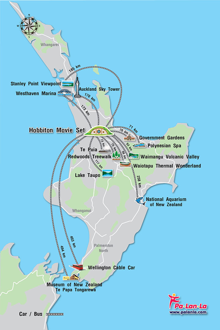 การเดินทาง : จากสนามบินโอ๊คแลนด์ เดินไปยังท่ารถบัส Domestic Terminalแล้วขึ้นรถบัสสาย Puhinui ไปลงที่ Manukau Bus Station จากนั้นต่อรถบัสสาย Auckland - Central ไปลงที่ป้าย Hobbiton Movie Set ใช้เวลาเดินทางประมาณ 4 ชั่วโมง