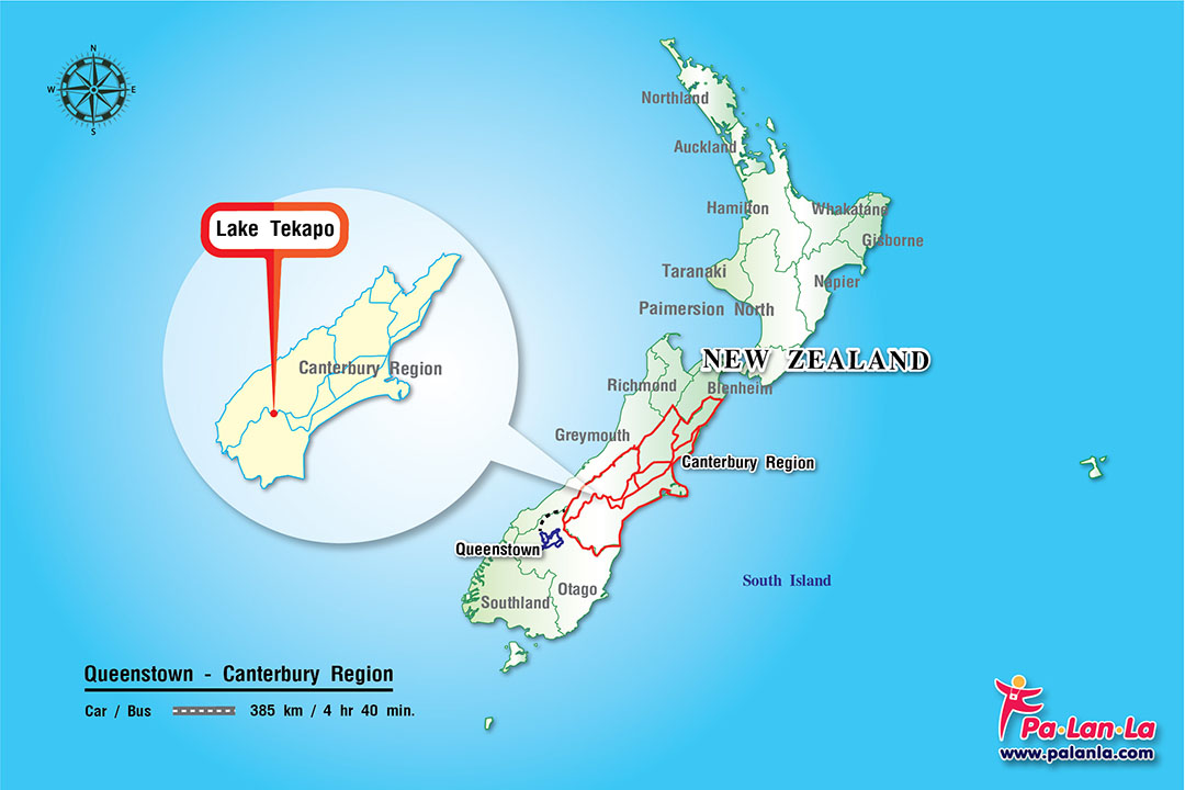 แผนที่ตั้ง ทะเลสาบเทคาโป (Lake Tekapo) เกาะใต้ ประเทศนิวซีแลนด์