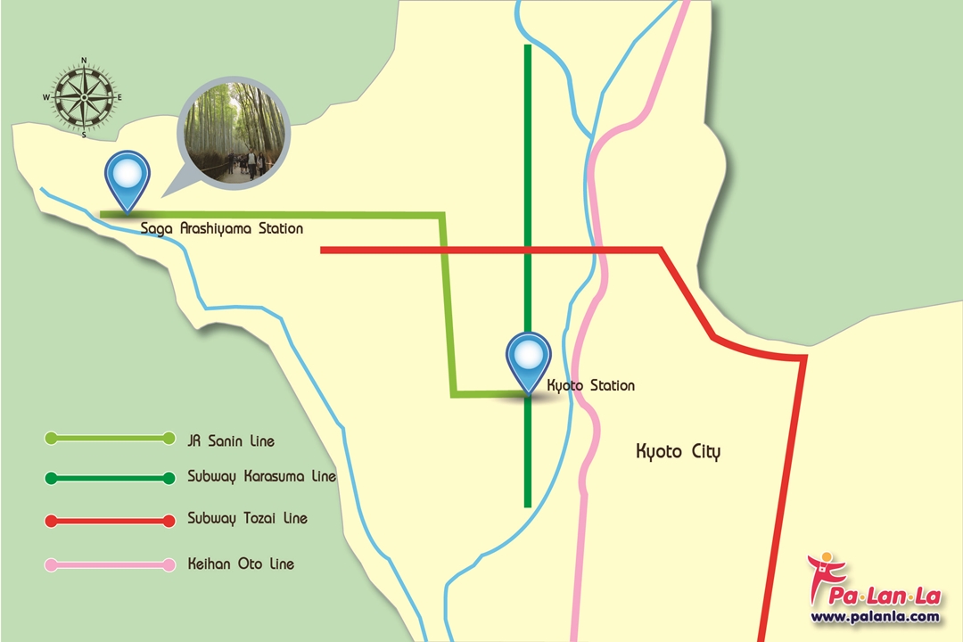 - รถไฟ รถไฟสาย JR Sagano สามารถเดินทางจาก Kyoto Station หรือจากสถานีอื่นๆ มาลงที่สถานี Saga-Arashiyama ค่าโดยสารเริ่มต้นที่ 140 เยน ขึ้นอยู่กับระยะทาง จากนั้นเดินต่อจากสถานีรถไฟประมาณ 550 เมตรมายังบริเวณด้านหลังของวัดเทนริวจิ จะพบกับทางเข้าป่าไผ่