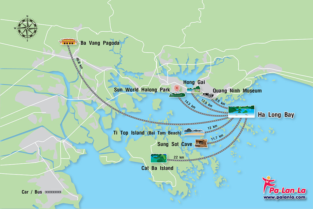 การเดินทาง : จากใจกลางเมืองกว๋างนิญ ไปยังท่าเรือ Bai Chay Pier หรือท่าเรือ Tuan Chau Pier บริเวณริมชายฝั่งอ่าวฮาลอง มีระยะทางประมาณ 35-40 กิโลเมตร ใช้เวลาเดินทางประมาณ 1 ชั่วโมง