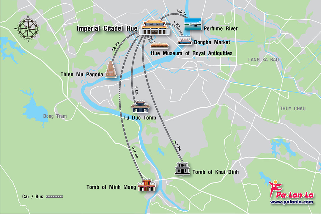แผนที่แสดงตำแหน่ง 8 สถานที่เที่ยวยอดนิยมในเมืองเว้ ประเทศเวียดนาม
