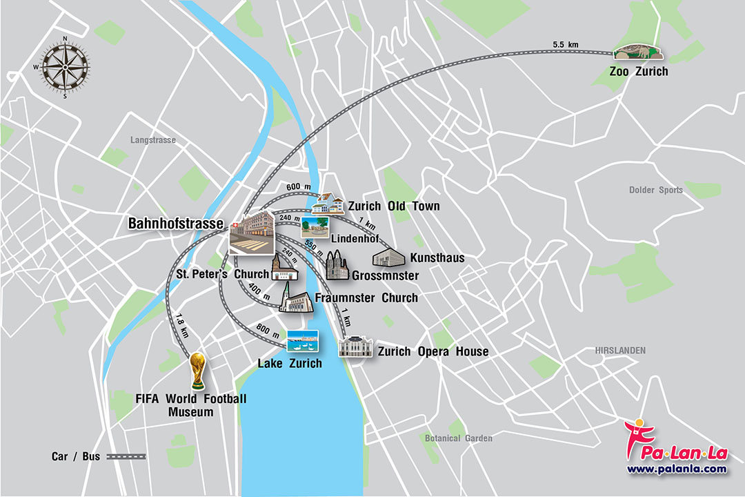ถนนบานโฮฟซตราเซอร์ (Bahnhofstrasse) ถือเป็นหนึ่งในจุดที่ใครมาเที่ยวซูริคก็จะต้องเยือน บานโฮฟซตราเซอร์เป็นถนนการค้าเก่าแก่ความยาว 1.4 กิโลเมตร ทอดตัวผ่านศูนย์กลางของเมืองซูริค ย่านการค้าบริเวณนี้รุ่งเรืองมาตั้งแต่ศตวรรษที่ 14 และได้มีการก่อสร้างอาคารสถาปัตยกรรมสวยงามขึ้นหลายแห่งในช่วงศตวรรษที่ 19 ตลอดสองข้างทางนั้นเรียงรายไปด้วยห้างสรรพสินค้าและร้านค้าร่วม 100 ร้านค้า มีร้านค้าแบรนด์เนมระดับโลกมากมาย จนได้ชื่อว่าเป็น “ถนนช้อปปิ้งที่แพงที่สุดในโลก” จุดเด่นของถนนบานโฮฟซตราเซอร์คือ เป็นแหล่งรวมนาฬิกาชั้นนำของโลก รวมถึงเป็นที่ตั้งของร้านเสื้อผ้า น้ำหอม เครื่องประดับ รองเท้า และร้านช็อกโกแลตชื่อดังหลายๆ ร้าน นอกจากบานโฮฟซตราเซอร์จะเป็นถนนสายช้อปปิ้งที่คึกคักเต็มไปด้วยสีสันและชีวิตชีวาแล้ว ยังเป็นถนนสำคัญที่เชื่อมต่อกับรถราง โดยมี Paradeplatz (หรือ Parade Square) เป็นจุดเปลี่ยนขบวนรถรางที่ผู้คนพลุกพล่าน แม้ว่าข้าวของต่างๆ บนถนนสายนี้จะมีราคาที่สูงลิบ แต่ก็ถือว่าคุ้มกับได้มาเดินชมบรรยากาศของถนนที่ได้ชื่อว่าเป็น “ถนนช้อปปิ้งที่แพงที่สุดในโลก” แห่งนี้
