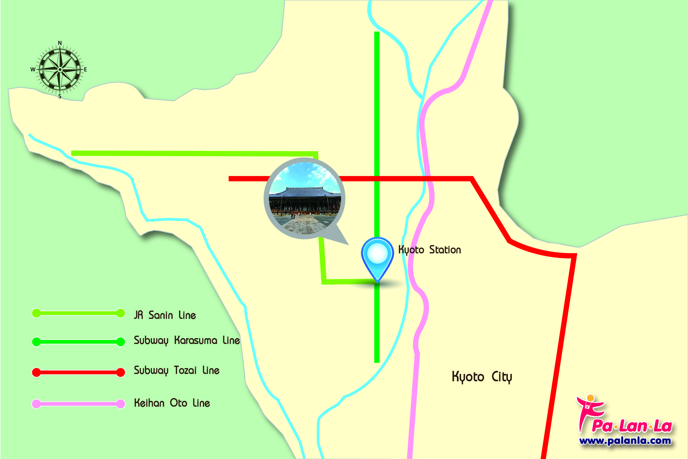 - รถบัส โดยสารรถ Kyoto City Bus สาย 9, 28 และ 75 ลงป้าย Nishi Hongwanji-mae ค่าโดยสารเริ่มต้นที่ 210 เยน