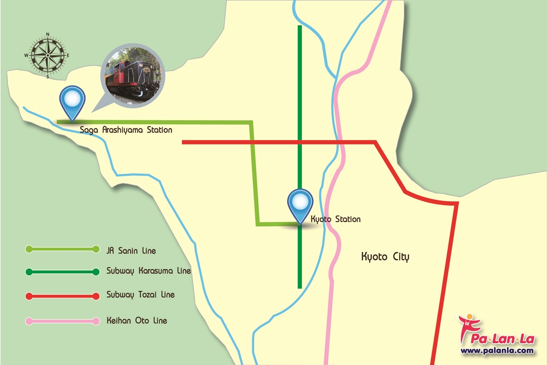 - รถไฟ โดยสารรถไฟสาย JR Sagano สามารถเดินทางจาก Kyoto Station หรือจากสถานีอื่นๆ มาลงที่สถานี Saga-Arashiyama ค่าโดยสารเริ่มต้นที่ 140 เยน