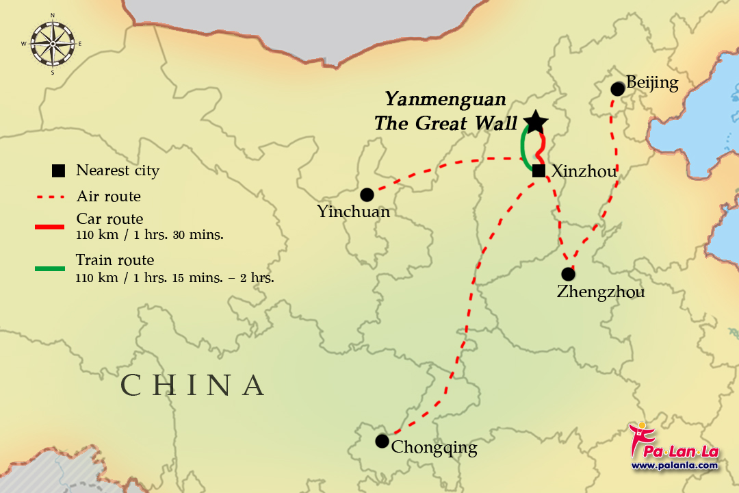 กำแพงเมืองจีนด่านเยี่ยนเหมินกวน ตั้งอยู่ใกล้กับเมืองซินโจว (忻州 / Xinzhou) มณฑลซานซี ประเทศจีน โดยวิธีที่สะดวกและรวดเร็วที่สุด ที่นักท่องเที่ยวจะเดินทางมายังที่นี่คือ ใช้บริการเที่ยวบินที่บินมายัง ท่าอากาศยานซินโจวอู่ไถซาน (忻州五台山机场 / Xinzhou Wutaishan Airport / WUT) อาทิ