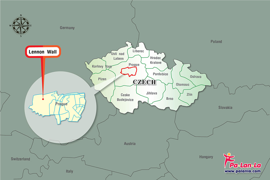 กำแพงเลนนอน ตั้งอยู่ในจัตุรัสเล็กๆ อันเงียบสงบใกล้กับสถานทูตฝรั่งเศสในกรุงปราก