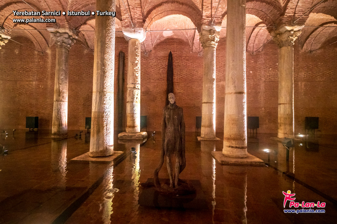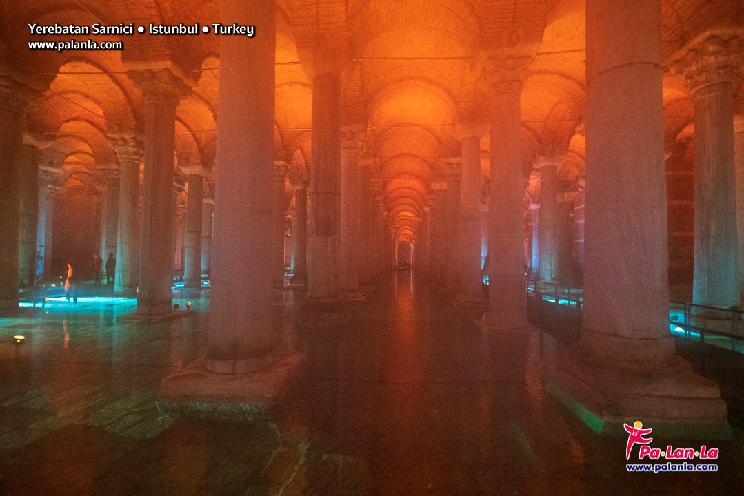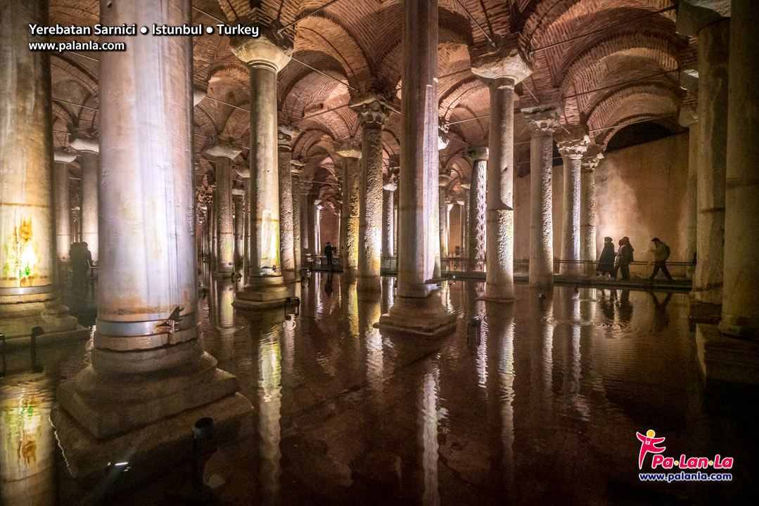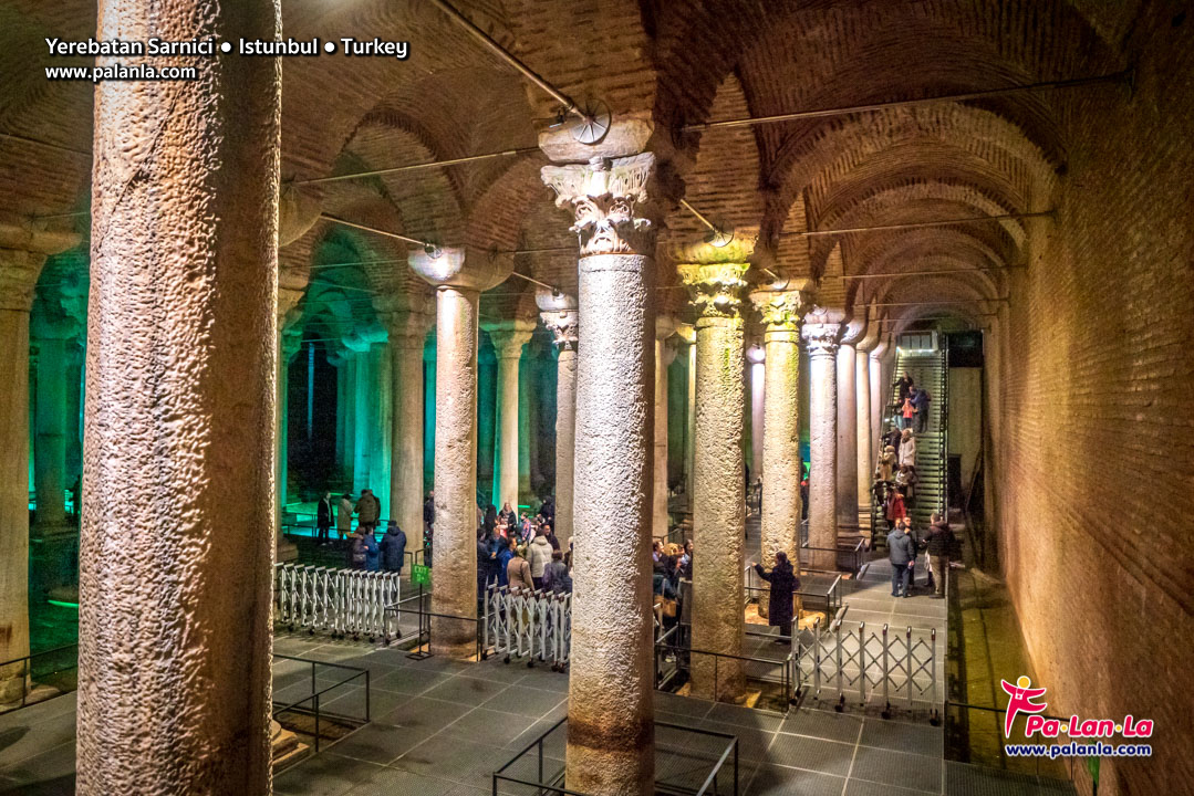 ภายในอุโมงค์เก็บน้ำเยเรบาตันประกอบด้วยเสากรีกขนาดใหญ่ 336 ต้นที่ค้ำเรียงรายเป็นทิวแถว