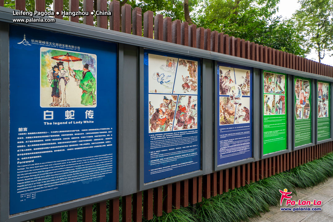 เจดีย์แห่งนี้ยังมีความเกี่ยวข้องกับตำนานนางพญางูขาว เรื่องราวความรักอันลึกซึ้งระหว่างบัณฑิตหนุ่มกับสาวงามซึ่งแท้จริงแล้วไม่ใช่มนุษย์ โดย “ฝ่าไห่” ซึ่งเป็นเจ้าอาวาสวัดจินซานล่วงรู้ว่าหญิงสาวเป็นปีศาจงูขาวแปลงกายมา จึงต้องการช่วยเหลือชายหนุ่มให้รอดพ้นจากการดูดกลืนวิญญาณ โดยได้ต่อสู้และจับนางพญางูขาวไปจองจำไว้ใต้เจดีย์เหลยเฟิง และสาปเอาไว้ว่านางจะกลับสู่โลกมนุษย์ได้ก็ต่อเมื่อน้ำในทะเลสาบซีหูจะแห้งหมดและเจดีย์ล้มลงแล้วเท่านั้น