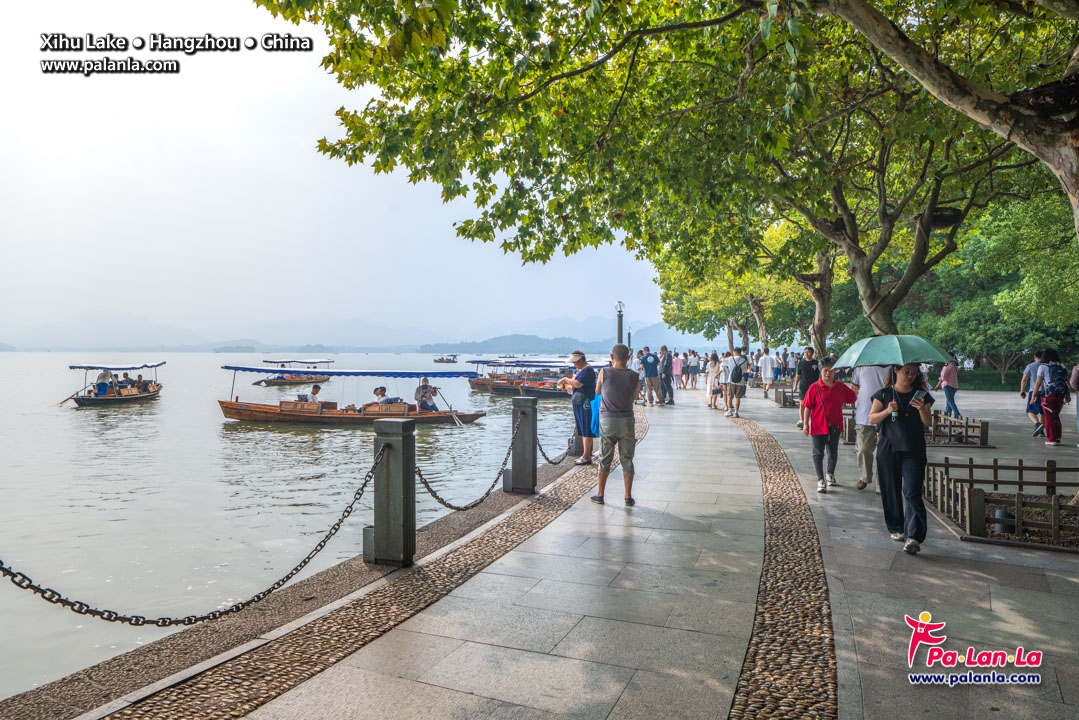 มีทางเดินกว้างขวางและต้นไม้ให้ร่มเงารอบๆ ทะเลสาบซีหู