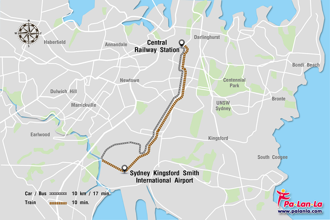 - รถไฟ ราคา $18.5 ใช้เวลาประมาณ 15 นาที รถมาทุกๆ 15 – 20 นาที http://www.airportlink.com.au