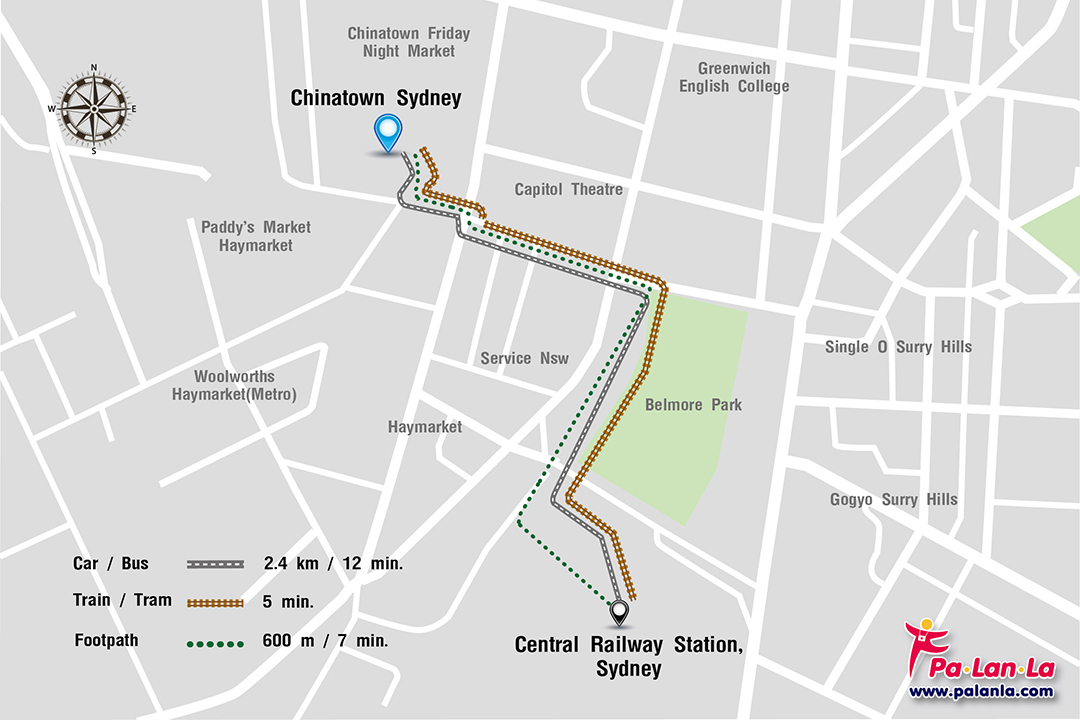 ไชน่าทาวน์อยู่ไม่ไกลจากสถานีรถไฟเซ็นทรัล (Central station) ใช้เวลาเดินประมาณ 10 นาที ทั้งนี้หากนักท่องเที่ยวไม่ต้องการเดินก็มีบริการรถไฟฟ้ารางเบา (Light rail) จากสถานีรถไฟเซ็นทรัลไปยังแพดดี้ส์มาร์เก็ต (Paddy’s market) ในเขตไชน่าทาวน์