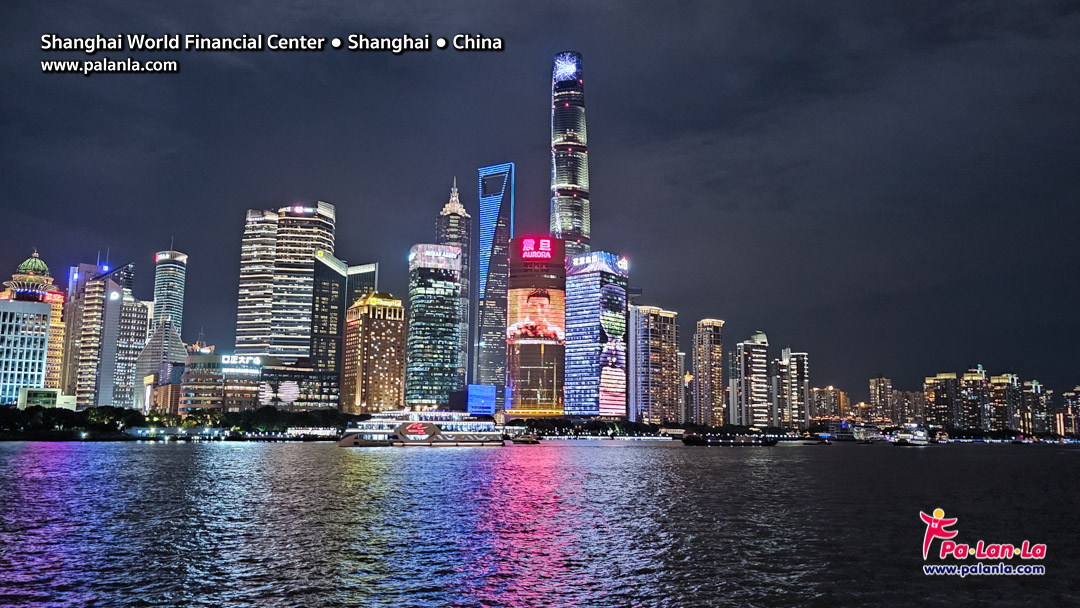 ทัศนียภาพสวยๆ ริมแม่น้ำหวงผู่ บริเวณตรงกลางภาพมีอาคารรูปทรงคล้ายรูเปิดขวดของศูนย์กลางการเงินโลกเซี่ยงไฮ้ท่ามกลางตึกสูงอื่นๆ ที่รายล้อม