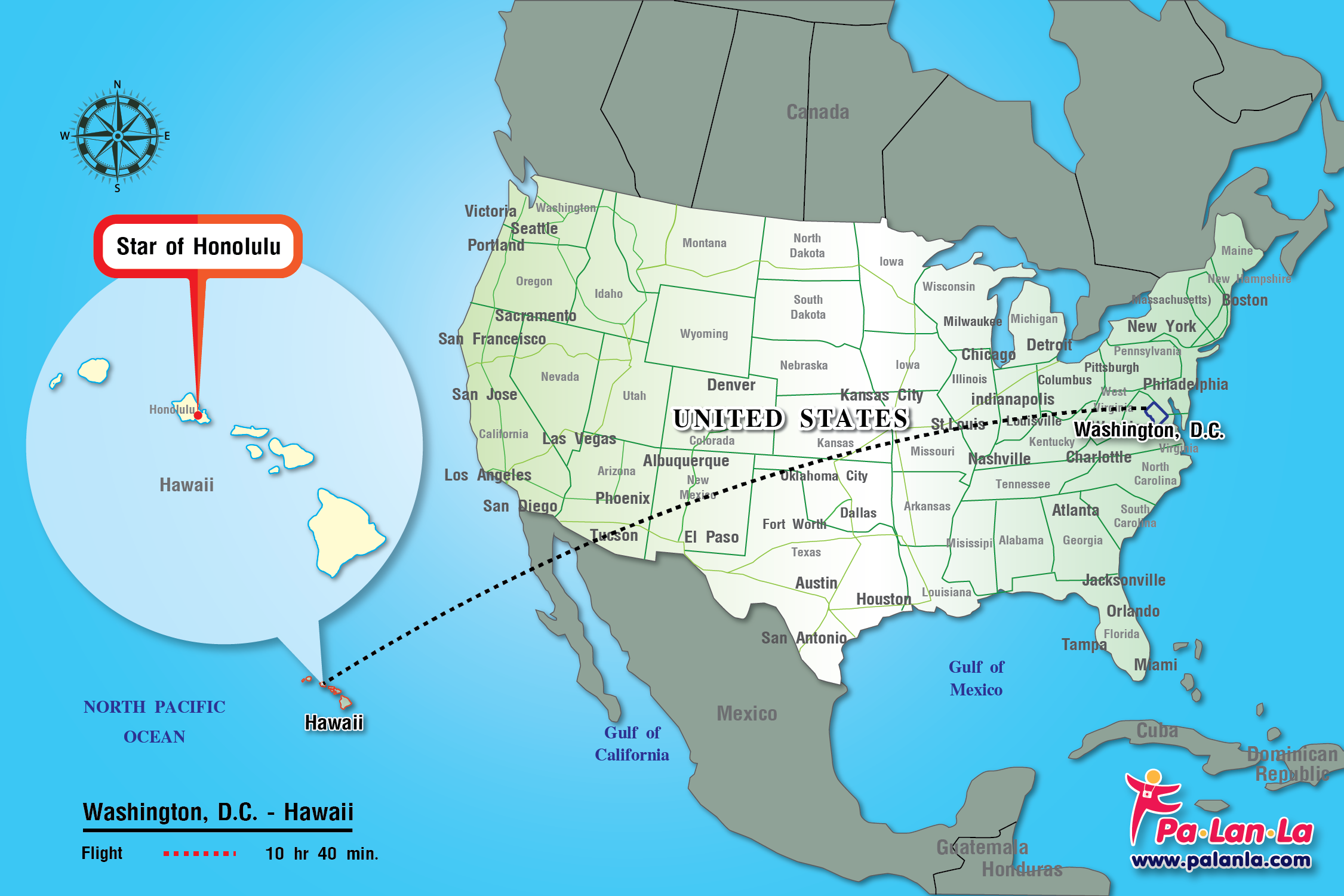 ขณะนี้ยังไม่มีสายการบินใดที่ให้บริการเที่ยวบินตรงระหว่างประเทศไทยกับฮาวาย (Hawaii) ประเทศสหรัฐอเมริกา เส้นทางส่วนใหญ่มีจุดแวะอย่างน้อย 1 แห่ง ใช้เวลาเดินทางประมาณ 17 - 28 ชั่วโมง ขึ้นอยู่กับสายการบิน โดยเส้นทางที่นิยมมากที่สุดคือ กรุงเทพมหานคร ท่าอากาศยานสุวรรณภูมิ Suvarnabhumi Airport (BKK) ไป โฮโนลูลู ท่าอากาศยานนานาชาติโฮโนลูลู (HNL)