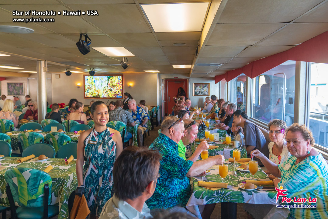 ซึ่งบนเรือก็จะมีอาหารรสเลิศทั้งแบบบุฟเฟ่ต์และแบบเสิร์ฟเป็นคอร์สๆ (ตามแต่แพ็คเกจการล่องเรือที่เลือก) จากเชฟมืออาชีพที่ปรุงอย่างพิถีพิถันให้ได้อิ่มอร่อย รวมทั้งมีบริการบาร์พร้อมค็อกเทลและเครื่องดื่มหลากหลายให้ได้จิบเรียกความสดชื่น พร้อมๆ กับเพลิดเพลินและดื่มด่ำกับวัฒนธรรมท้องถิ่นผ่านการแสดงอันน่าตื่นตาตื่นใจ ตั้งแต่การเต้นฮูลาริมท่าเรือ ไปจนถึงดนตรีฮาวายที่เปี่ยมด้วยชีวิตชีวา และการแสดงโพลินีเซียนสุดอลังการ นอกจากนี้ยังมีการแสดงพลุดอกไม้ไฟในคืนวันศุกร์อีกด้วย