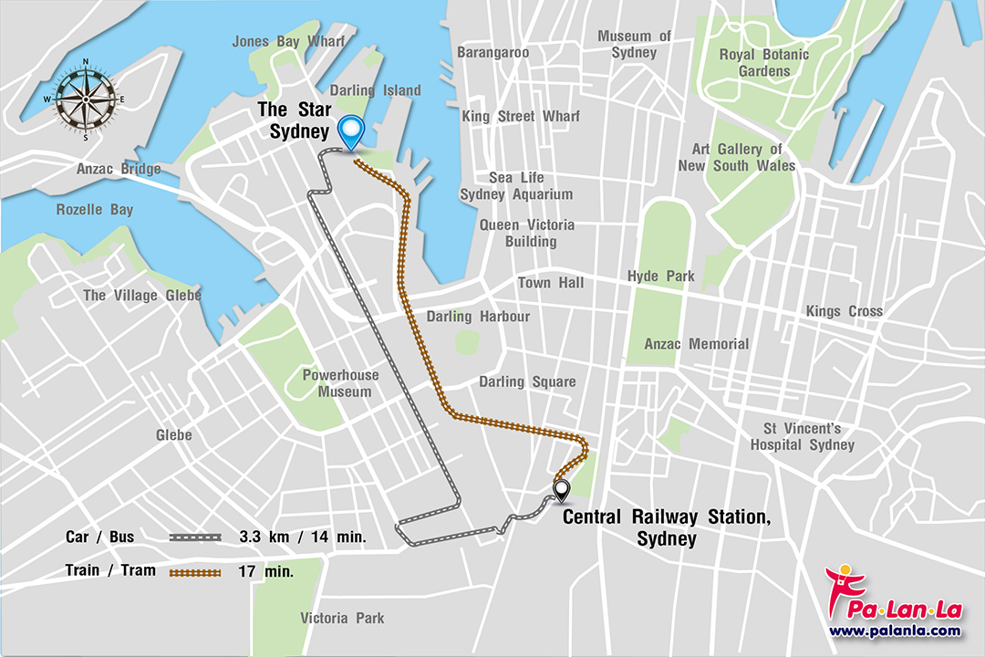 - รถไฟฟ้ารางเบา (Ligh Rail) สาย L1 รถวิ่งจากสถานี Central, China Town, Paddy’s Market, Darling Harbour ไปลงที่ The Star