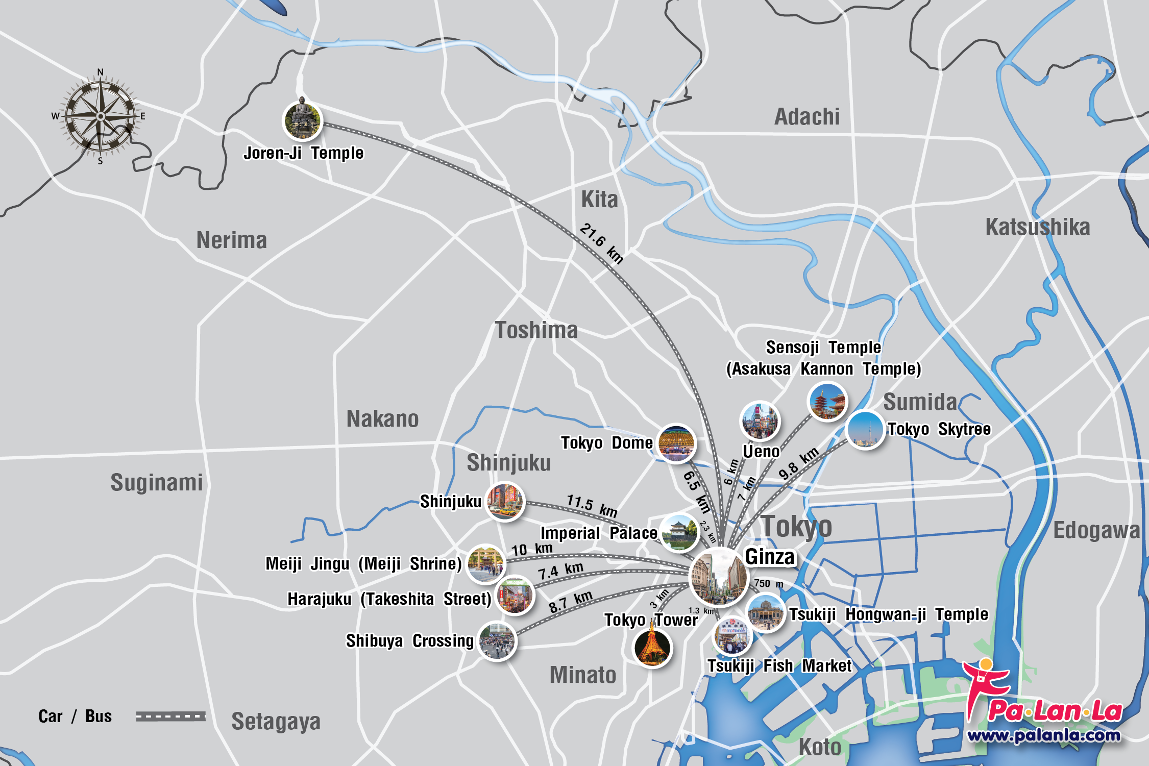 แผนที่แสดงตำแหน่ง 14 สถานที่เที่ยวยอดนิยมในโตเกียว ประเทศญี่ปุ่น