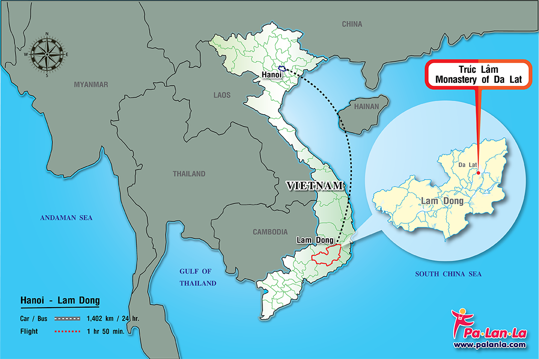 จากท่าอากาศยานนานาชาติเลียนเคือง (Lien Khuong Airport) ไปยัง วัดตั๊กลัม (Truc Lam Monastery of Da Lat) มีระยะทาง 25 กิโลเมตร ใช้เวลาในการเดินทางโดยรถยนต์ประมาณ 25 นาที