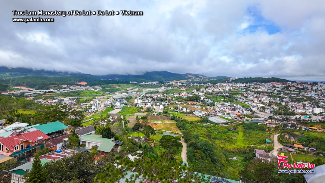 ทัศนียภาพของบ้านเรือนในเมืองดาลัดที่โอบล้อมด้วยภูเขา มองจากบนกระเช้าที่ขึ้นสู่วัดตั๊กลัม