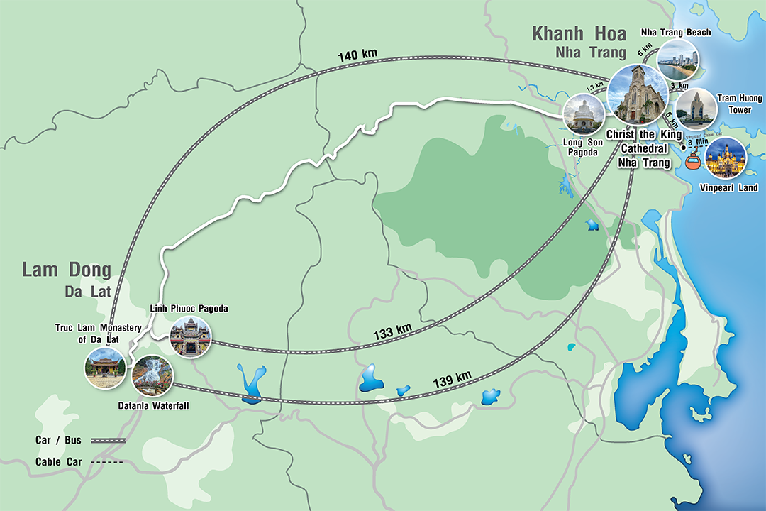 แผนที่แสดงตำแหน่งของ 8 สถานที่ท่องเที่ยวยอดนิยมในเมืองญาจาง (Nha Trang) – เมืองดาลัด (Da Lat)