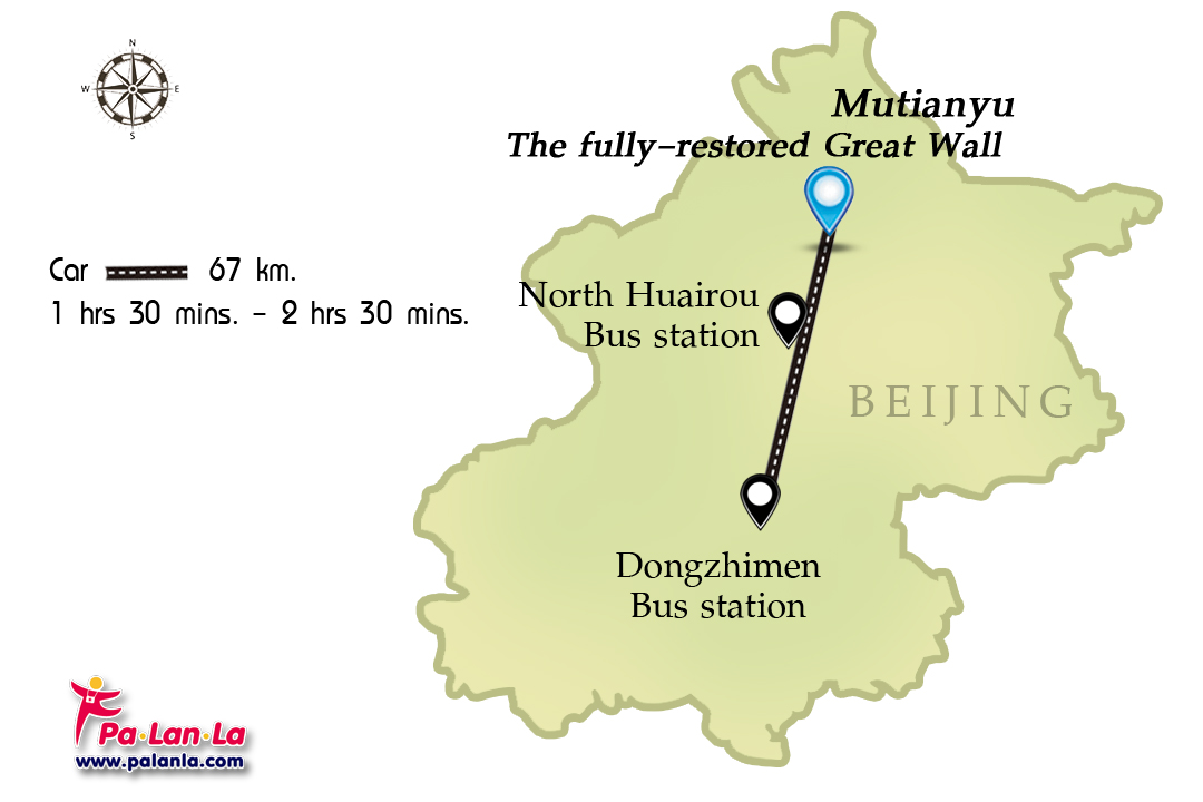 และหลังจากมาถึงเมืองปักกิ่งแล้ว นักท่องเที่ยวสามารถเลือกเดินทางต่อไปยังกำแพงเมืองจีนมู่เถียนอวี้ ซึ่งอยู่ห่างจากตัวเมืองไปทางทิศตะวันออกเฉียงเหนือเพียง 67 กิโลเมตร ได้ด้วยวิธีดังต่อไปนี้ คือ