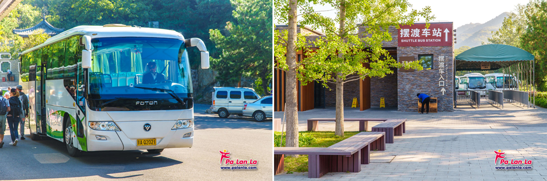 หลังจากนักท่องเที่ยวซื้อบัตรเข้าชมกำแพงเมืองจีนมู่เถียนอวี้เรียบร้อย นักท่องเที่ยวต้องเดินต่อไปยังจุดบริการรถชัตเตอร์บัสที่จะพานักท่องเที่ยวเข้าไปยังจุดเริ่มต้นของการชมกำแพงเมืองจีนมู่เถียนอวี้