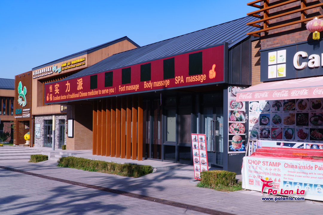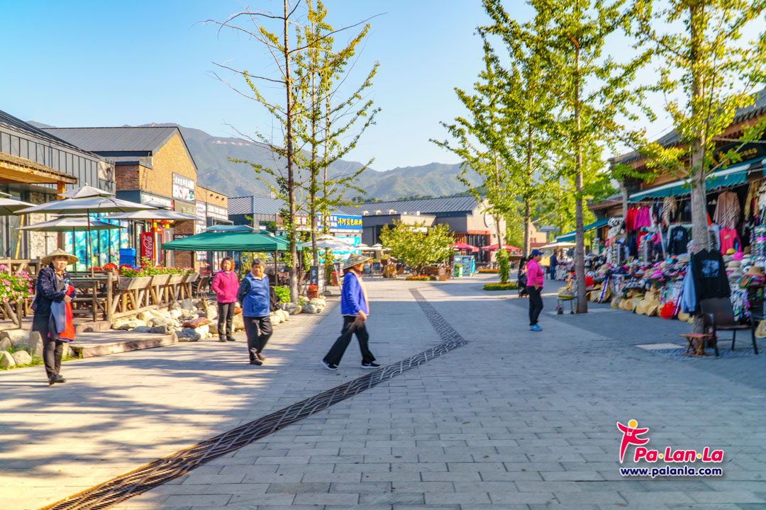 แถวร้านจำหน่ายอาหาร,เครื่องดื่ม และของที่ระลึกในบริเวณกำแพงเมืองจีนมู่เถียนอวี้