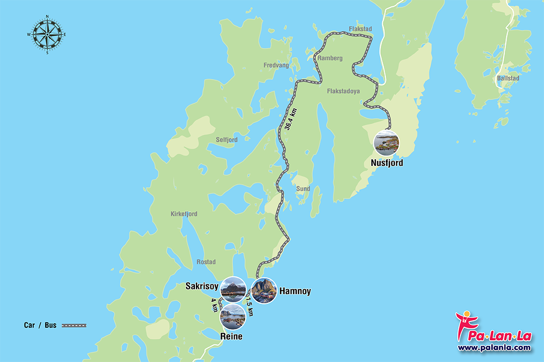 หมู่บ้านไรเนอร์ (Reine) - หมู่บ้านซาคริซอย (Sakrisoy) - หมู่บ้านแฮมนอย (Hamnoy) - หมู่บ้านนูส์ฟยอร์ด (Nusfjord)