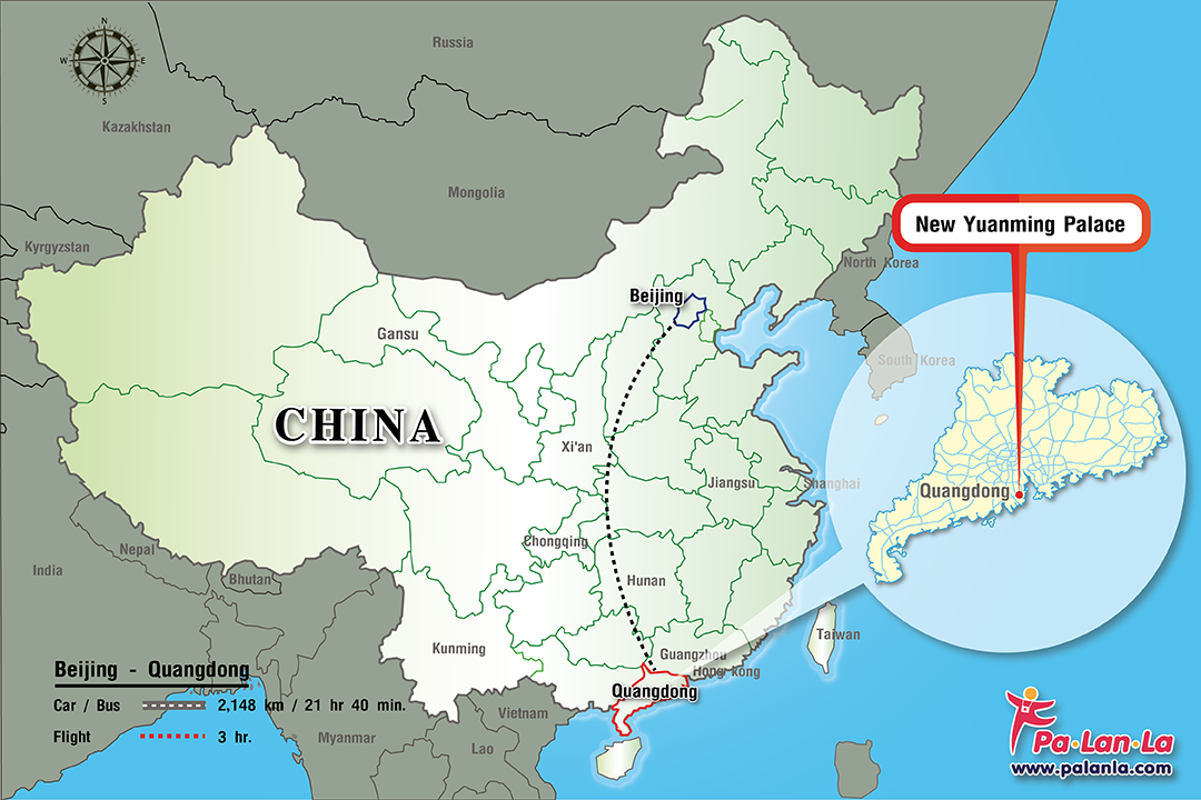พระราชวังหยวนหมิงใหม่ (New Yuanming Palace) ตั้งอยู่ที่ เมืองจูไห่ (Zhuhai) มณฑลกวางตุ้ง ประเทศจีน ห่างจากเมืองหลวงคือปักกิ่ง 2148 กิโลเมตร ใช้เวลาเดินทางโดยรถยนต์ 21 ชั่วโมง 40 นาที