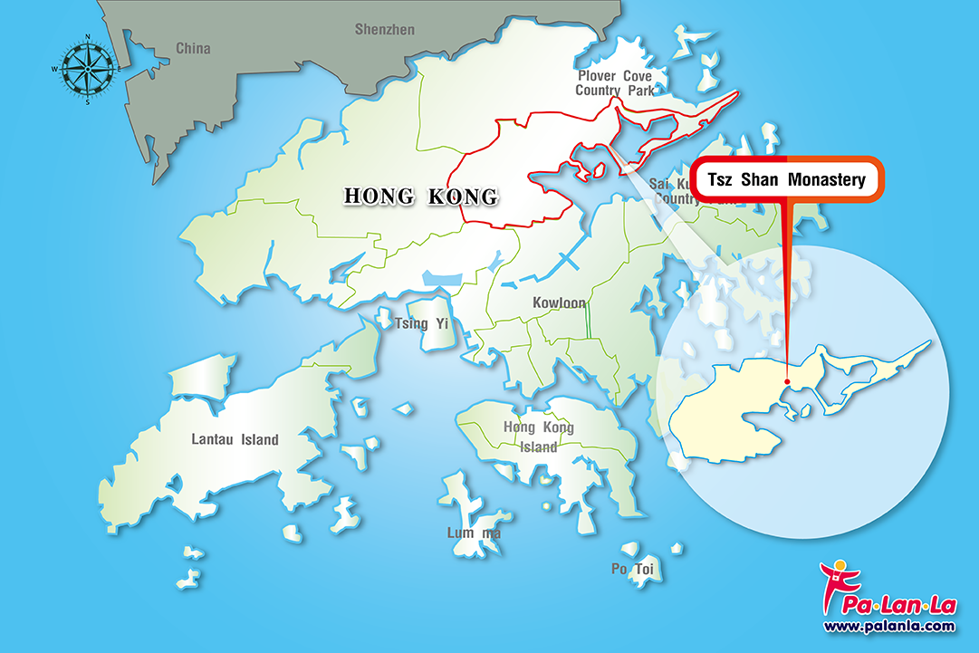 - รถไฟ ลงสถานี Tai Po Market ทางออก A3 แล้วขึ้นรถเมล์สาย 20B ไปลงที่บริเวณด้านหน้าทางเข้าวัด หรือต่อรถแท็กซี่สีเขียวที่จอดรอที่หน้าสถานี Tai Po Market ไปยังวัด