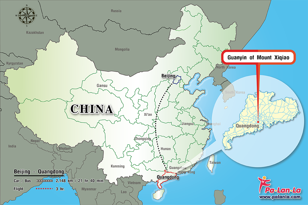 เจ้าแม่กวนอิมแห่งเขาซีเฉียว (Guanyin of Mount Xiqiao) ตั้งอยู่ที่เมืองฝอซาน (Foshan) ห่างจากกวางโจว 62 กิโลเมตร ใช้เวลาเดินทางโดยรถยนต์ประมาณ 1 ชั่วโมง