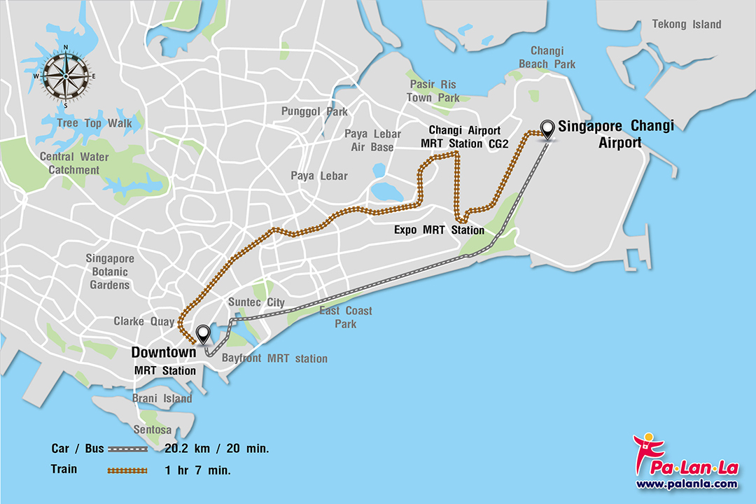 - รถไฟใต้ดิน จากสนามบินสิงคโปร์ ชางงี Terminal 2 และ 3 นักท่องเที่ยวสามารถขึ้นรถไฟใต้ดินสายสีเขียว (East West Line) ที่สถานี Changi Airport MRT CG2 มาลงที่สถานี Expo MRT Station แล้วต่อรถไฟใต้ดินสายสีน้ำเงิน (Downtown Line) มาลงที่สถานี Downtown MRT Station ใช้เวลาเดินทางประมาณ 1 ชั่วโมง 7 นาที รถไฟใต้ดินให้บริการตั้งแต่ 05.30 น. – 23.18 น.
