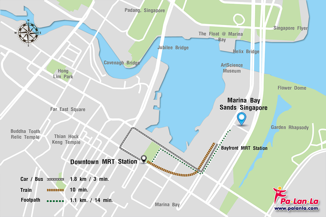 - การเดิน จากสถานีรถใต้ดิน Downtown MRT Station สามารถเดินไปยังมารีน่าเบย์แซนด์ และแซนด์สกายพาร์ค ระยะทางประมาณ 1.1 กิโลเมตร ใช้เวลาประมาณ 14 นาที