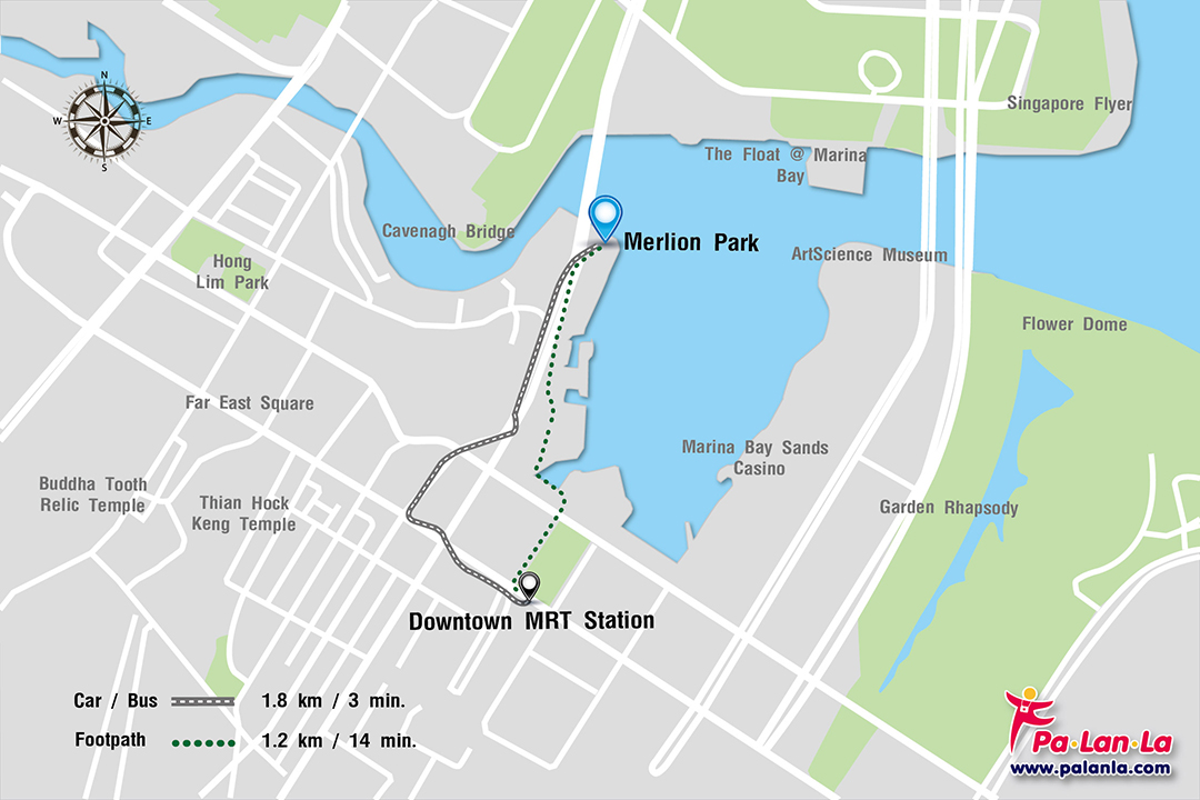 - การเดิน จากสถานีรถไฟใต้ดิน Downtown MRT Station สามารถเดินไปยังเมอร์ไลอ้อน ระยะทางประมาณ 1.2 กิโลเมตร ใช้เวลาประมาณ 14 นาที