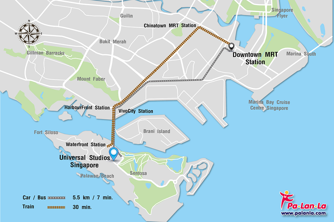 - รถไฟใต้ดิน ขึ้นรถไฟใต้ดินจากสถานี Downtown MRT Station ไปต่อรถไฟใต้ดินสายสีม่วง (North – East Line) ที่สถานี Chinatown MRT Station ไปลงที่สถานี Harbour Front MRT Station แล้วเดินไปขึ้นรถไฟโมโนเรล Sentosa Express ที่สถานี VivoCity ไปลงที่สถานี Waterfront เดินต่ออีกประมาณ 220 เมตร ใช้เวลาเดินทางประมาณ 30 นาที