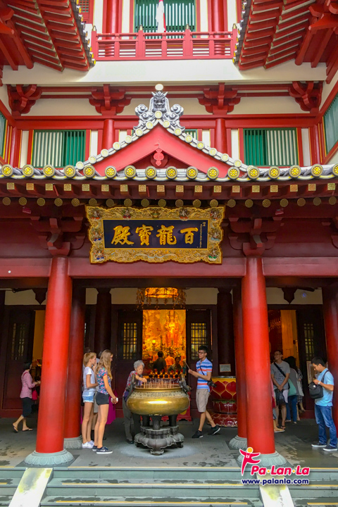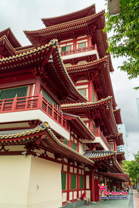 อาคารสีแดงสดของวัดพระเขี้ยวแก้วในย่านไชน่าทาวน์