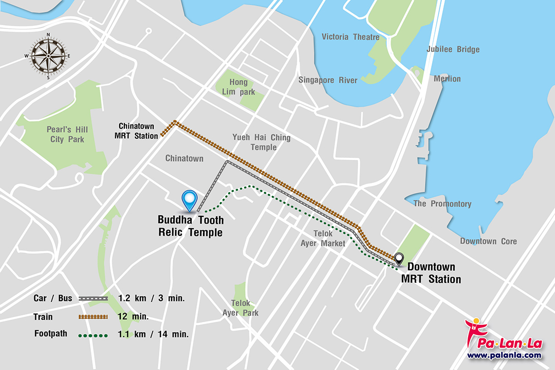 - รถไฟใต้ดิน ขึ้นรถไฟใต้ดินจากสถานี Downtown MRT Station ไปลงที่สถานี Chinatown MRT Station แล้วเดินต่ออีกประมาณ 400 เมตร ใช้เวลาเดินทางประมาณ 12 นาที