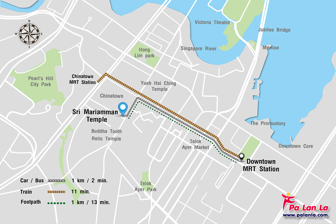 - รถไฟใต้ดิน จากสถานี Downtown MRT Station ไปลงที่สถานี Chinatown MRT Station แล้วเดินต่ออีกประมาณ 270 เมตร ใช้เวลาเดินทางประมาณ 11 นาที
