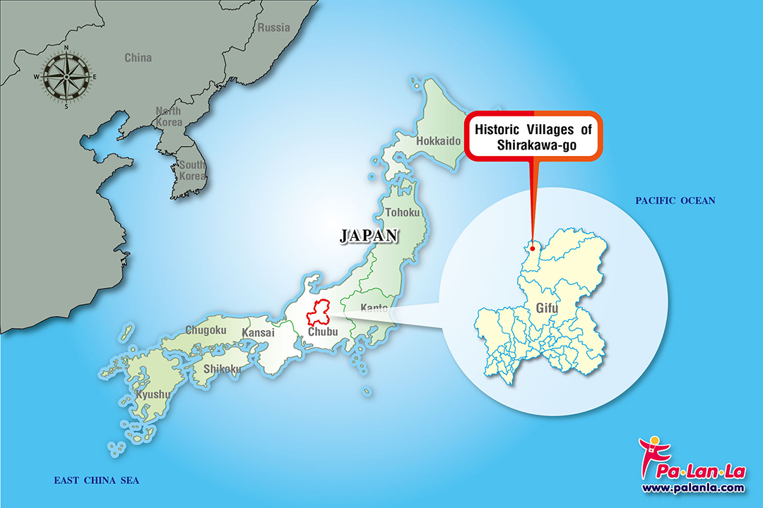 รูปทรงของบ้านเรือนแบบหลังคาทรงสูงในหมู่บ้านที่มีชื่อเรียกว่า “Gassho-zukuri” แปลว่า “เหมือนการพนมมือ”