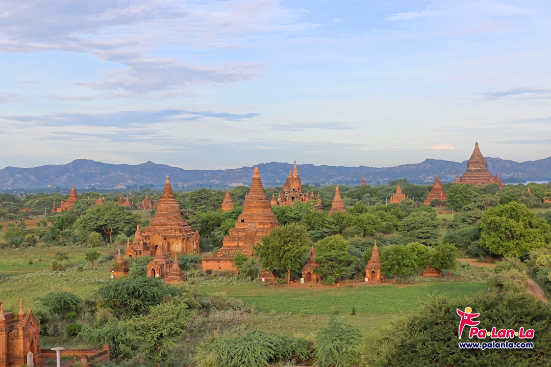 หมู่เจดีย์แห่งพุกามถูกอาบด้วยแสงพระอาทิตย์ในยามเย็น