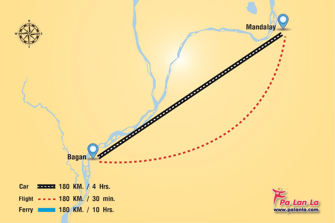 - เครื่องบิน ระหว่างเมืองมัณฑะเลย์และพุกาม มีสายการบิน Myanmar Airways ให้บริการเที่ยวบินตรงระหว่างทั้งสองเมือง ใช้เวลาเดินทาง 30 นาที ค่าโดยสารโดยประมาณอยู่ที่เที่ยวละประมาณ 2,000 บาท และอาจแตกต่างออกไปตามช่วงเวลาในการเดินทาง นักท่องเที่ยวสามารถตรวจสอบรายละเอียดเพิ่มเติมและจองบัตรโดยสารได้ที่ http://maiair.com/