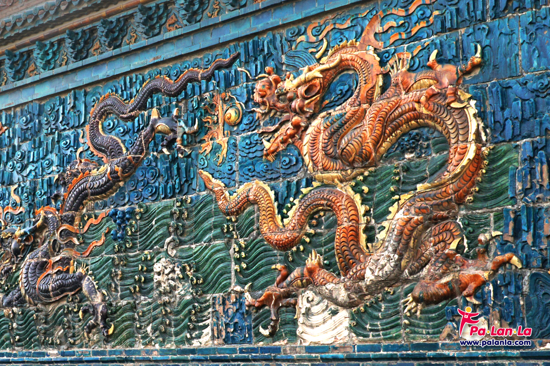 ลวดลายมังกรเล่นลูกแก้วกลางผืนน้ำและแผ่นฟ้าที่สร้างขึ้นจากกระเบื้องเคลือบสีสันสวยงาม
