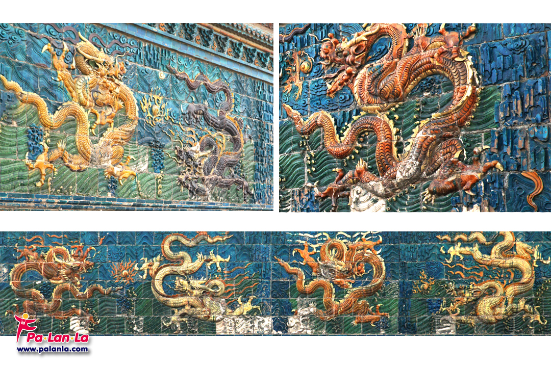 รูปมังกรบนกำแพงเก้ามังกรซึ่งอยู่ในอิริยาบถต่างๆ แต่ทุกตัวล้วนมีแค่สี่เล็บ