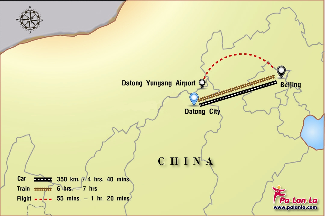 - เครื่องบิน เป็นวิธีการเดินทางที่รวดเร็วและสะดวกสบายที่สุด โดยนักท่องเที่ยวสามารถเลือกเที่ยวบินจากเมืองปักกิ่งมาลงที่ท่าอากาศยานต้าถงอวิ๋นกัง (大同云冈机场 / Datong Yungang Airport / DAT) ซึ่งใช้เวลาในการเดินทางเพียง 55 นาที – 1 ชั่วโมง 20 นาที เท่านั้น