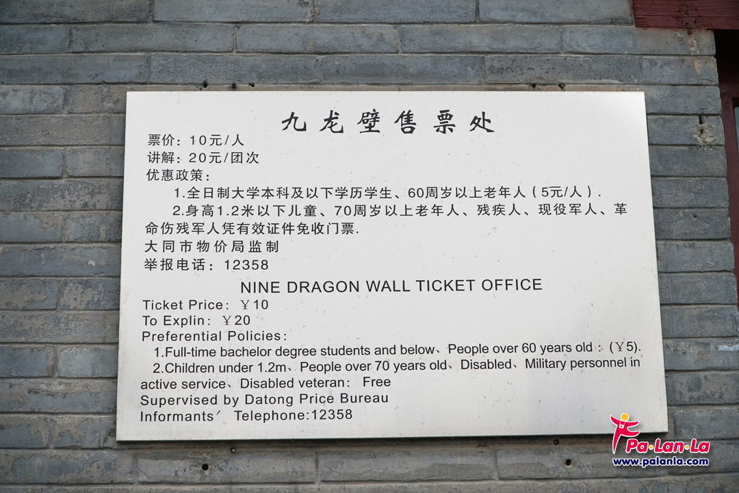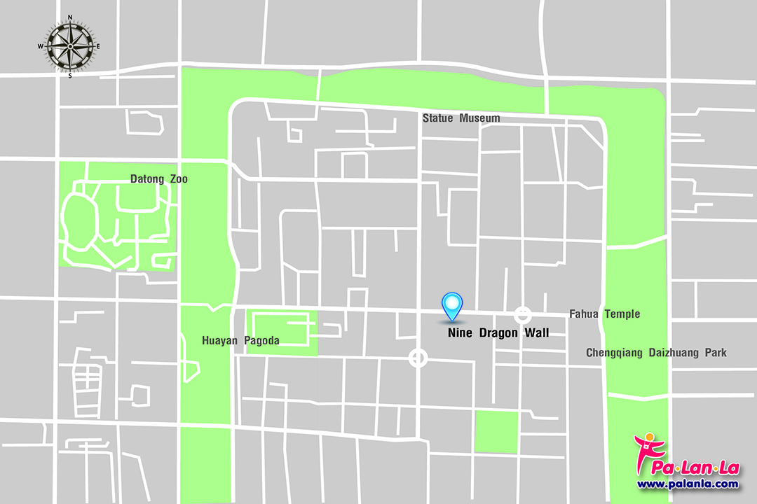 - รถบัสจากสถานีรถไฟ โดยเดินออกมาด้านหน้าสถานีรถไฟที่มีป้ายสถานีต้าถง (大同站) เลือกขึ้นรถโดยสารด่วนพิเศษหมายเลข 601 (快速公交601) ลงที่ป้ายต้าถงสือจง (大同十中) และขึ้นรถหมายเลข 38 ต่อ ก่อนเลือกลงที่ป้ายกำแพงเก้ามังกร (九龙壁) ใช้เวลาในการเดินทางรวมประมาณ 40 นาที โดยนักท่องเที่ยวสามารถดูรายละเอียดเส้นทางและรอบเวลาในการวิ่งของรถโดยสารด่วนพิเศษหมายเลข 601 ได้ที่ http://datong.8684.cn/x_6b39c850 และหมายเลข 38 ได้ที่ http://datong.8684.cn/x_9f55d40a