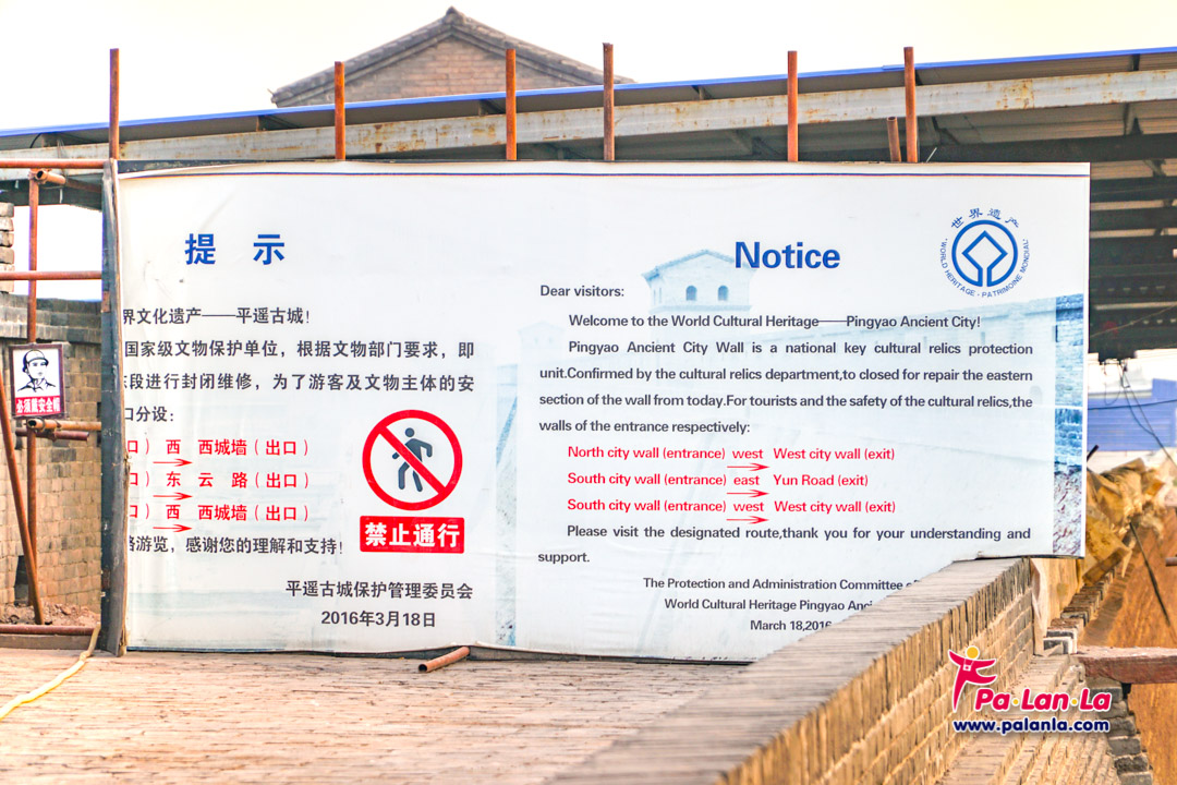 เมืองโบราณผิงเหยาเป็นมรดกโลกซึ่งมีอายุหลายร้อยปี ดังนั้น การเข้าชมบางส่วน อาทิ บริเวณกำแพงเมืองโบราณ นักท่องเที่ยวต้องใช้ความระมัดระวัง และเดินตามเส้นทางที่มีป้ายกำหนด บอกเอาไว้ เพื่อความปลอดภัยของนักท่องเที่ยวและเป็นการอนุรักษ์โบราณสถานเหล่านี้ไปด้วย