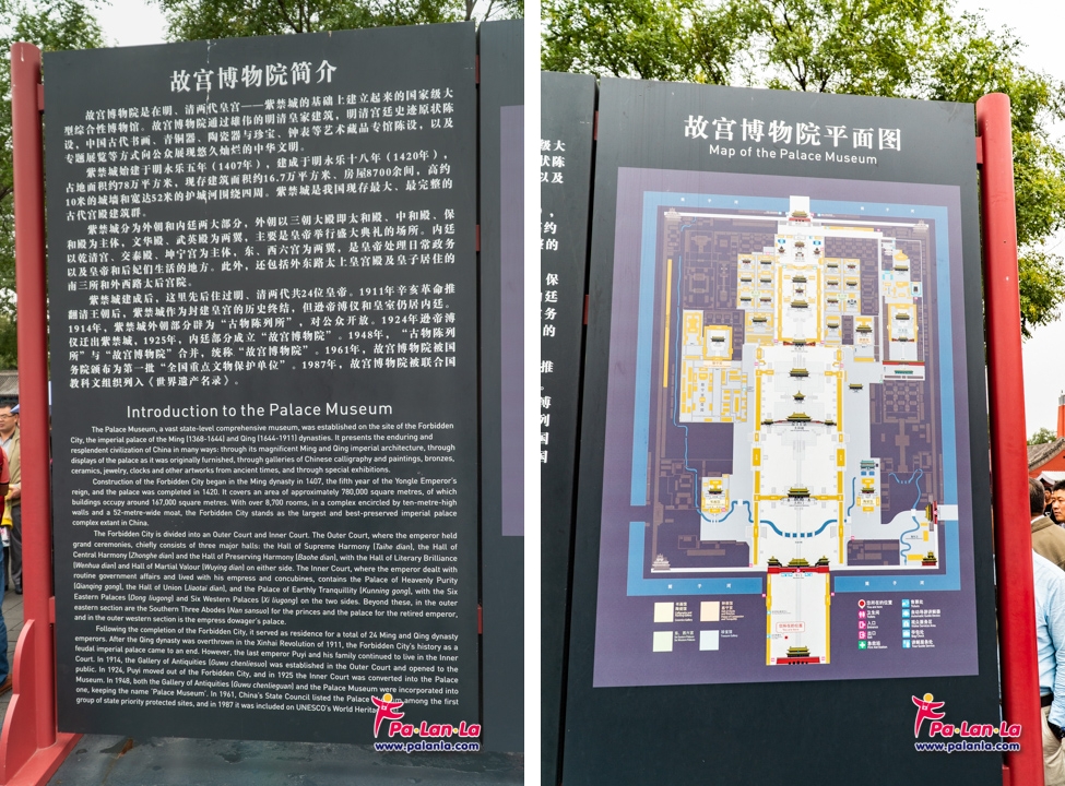 แผงผังและคำอธิบายถึงประวัติของพระราชวังต้องห้ามที่ยิ่งใหญ่