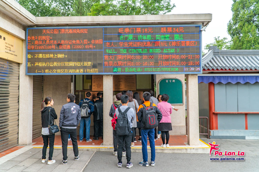 จุดจำหน่ายบัตรผ่านเข้าชมหอสักการะฟ้าเทียนถานโดยมีราคาแจ้งไว้ให้เห็นเด่นชัด