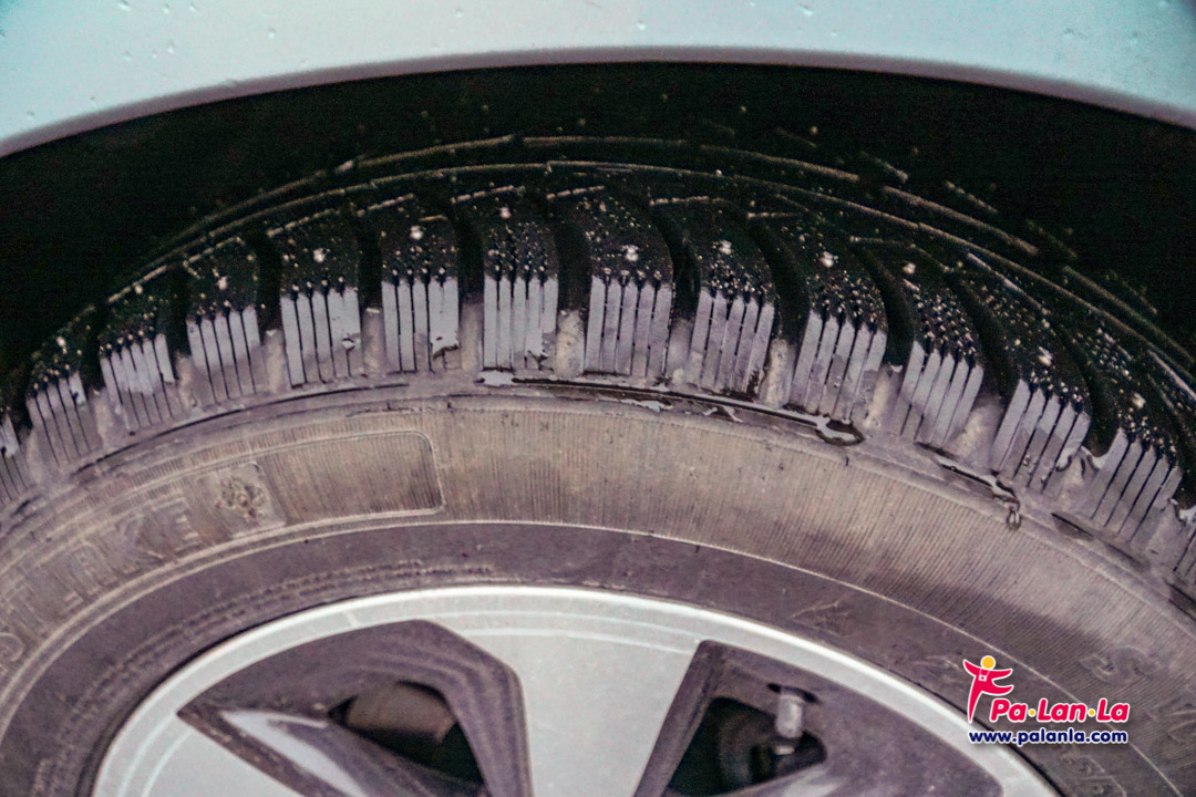 ล้อรถมีลักษณะเหมือนหัวตะปูติดอยู่ เพื่อให้ล้อยึดกับถนนในฤดูหนาวที่มีหิมะและถนนลื่น