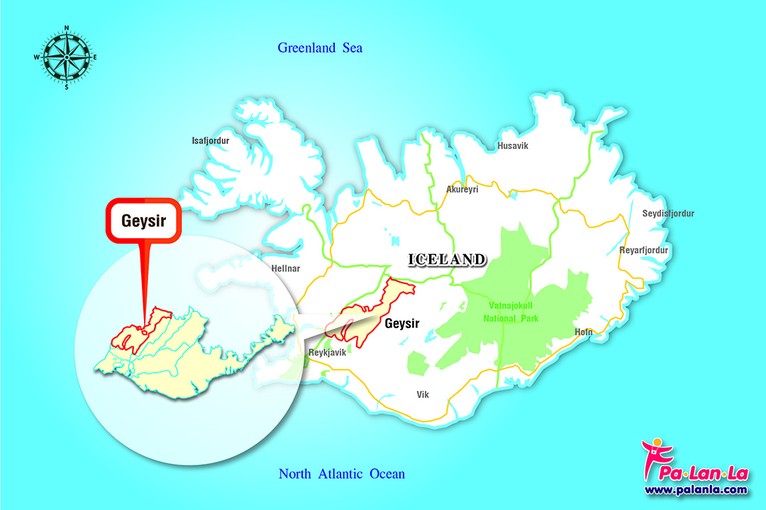 จากเมืองเรคยาวิกไปยังไกเซอร์ ใช้เส้นทาง Vesturlandsvegur/ถนนหมายเลข 49 ระยะเวลา 3 นาที (1.3 กม.) จากนั้นใช้ Þjóðvegur 1 และ Biskupstungnabraut ไปทาง ถนนหมายเลข 35 มุ่งไป Suðurland ระยะเวลา 1 ชม. 23 นาที (107 กม.)